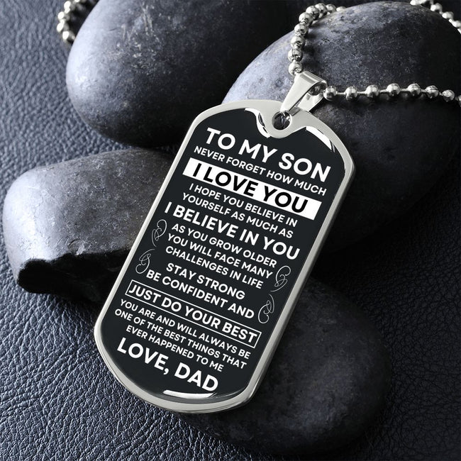 Are You Looking for the Perfect Gift for Your Son? Whether it's his Birthday, Graduation, Christmas, or another special occasion, this dog tag necklace is sure to be a heartfelt gift. You can even customize it further by having a special message engraved on the back of the dog tag. Purchase this BEST SELLER and we guarantee it will exceed your highest expectations!